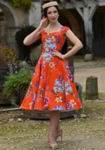 “Every step a little celebration.” De Tangerine Blossom swingjurk met sweetheart halslijn nodigt uit om te draaien en zwieren. De full swing rok zorgt voor speels volume, terwijl steekzakken en een blinde ritssluiting aan de achterzijde praktische elegantie toevoegen. Gemaakt van een stevige maar comfortabele katoenmix, en perfect te combineren met een petticoat voor een extra feestelijk effect. * Full swing * Sweetheart halslijn * Zijwaartse steekzakken * Blinde rits achterzijde * Combineer met een van onze petticoats voor een extra feestelijk effect * Valt bij een lengte van 1,70 m over de knie