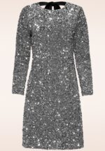 “Celebrate yourself, steal the spotlight.” Deze party-proof A-lijn jurk is uitgevoerd in een fluweelachtige, grijze stof met een lichte stretch, bezaaid met zilverkleurige pailletten en een zwarte strik aan de achterzijde. * A-lijn * Hoge, ronde halslijn * Zwart strikdetail achterzijde * Geen rits- of knoopsluiting; aantrekken en ‘ready to party’ * Volledig gevoerd * Reikt bij een lengte van 1,70 m tot net boven de knie