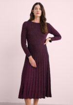 ”Shimmering in purple and knitted to perfection!” Deze prachtige midi-jurk heeft een aansluitende top met lange mouwen en een midi rok met ‘plooien’. Uitgevoerd in een superzachte, fijngebreide en stretchy gerecyclede stofmix in paars en donkerblauw die heerlijk draagt… perfect voor het nieuwe seizoen! * Midi jurk * Ronde halslijn * Lange mouwtjes * Geen rits of knopen; aantrekken en ready to go! * Valt bij een lengte van 1,70 m tot halverwege de kuit