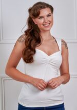 “Pure white, pure attitude!” Deze mouwloze retro top combineert een subtiele sweetheart halslijn met een geplooide buste die je vormen prachtig laat spreken. Gemaakt van 100% katoen voor een luchtig en comfortabel gevoel, terwijl de uitstraling pure vintage attitude blijft. * Subtiele sweetheart halslijn * Geplooide buste * Lang genoeg om op een normale heupbroek te dragen