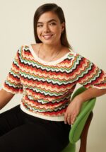 “Zigzag your way through the day.” Deze retrolicious top heeft een elegante boothals, wijde uitlopende mouwen en een all-over opengewerkt ajour zigzagpatroon. Ze is uitgevoerd in een soepele en stretchy, fijngebreide organische katoen die heerlijk comfortabel draagt. * Boothals * Wijd uitlopende 1/2 mouwen * Lang genoeg om op een normale heupbroek te dragen