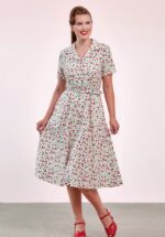 “Cherry-picked charm in every twirl.” Deze swing jurk heeft een elegante V-halslijn, reverskraagje, korte mouwen en loopt uit in een prachtige swing rok voor een super vrouwelijk silhouet. Uitgevoerd in een stevige, maar soepele 100% katoen (stretcht niet) in crème met een retro print van kersjes. * Swing model * V-halslijn * Reverskraagje * Korte mouwtjes met omslagjes * Reeks knopen * Afneembare riem * Zijwaartse steekzakken * Valt bij een lengte van 1,70 m tot over de knie