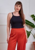 ”Très Chic!” Judy laat de temperatuur spontaan stijgen en is uitgevoerd in een soepele en stretchy, zwarte crêpe achtige stof, die heerlijk draagt. * Gevoerde top met roezel * Blinde rits achterzijde * Afneembaar striklint, voor een extra ‘snatched’ taille * Lange, wijde pijpen