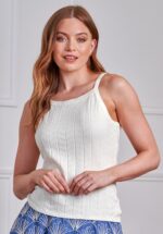 “Comfort never looked this good.” Deze veelzijdige knitted cutie heeft een verfijnd zigzagpatroon en is uitgevoerd in een soepele, fijngebreide en stretchy viscosemix in crème die garant staat voor ultiem draagcomfort. * Mouwloos * Stretchy ribboord * Lang genoeg om op een normale heupbroek te dragen