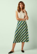 “Stripes, steps, and endless style!” Deze midi rok is een echte eyecatcher! Ze heeft een dunne, comfortabele tailleband en is voorzien van een rits met haaksluiting in de zijnaad, waardoor ze makkelijk draagt en soepel over je heupen valt. Ze is uitgevoerd in een luchtige en soepele EcoVero viscose, met een frisse gestreepte print in groen, crème en blauwtinten. * A-lijn * Rits met haaksluiting in de zijnaad * Valt bij een lengte van 1,70 m over de knie