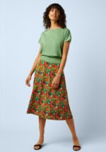 “A tropical twirl a day keeps the grey away!” Deze vrolijke midi rok heeft een comfortabele elastische tailleband en zwiert prachtig met je mee bij elke stap. De soepelvallende EcoVero viscosemix voelt zacht, luchtig en heerlijk licht op de huid. De kleurrijke Puerto-print met bloemen en fruit op een donkerblauwe achtergrond geeft haar een speelse, tropische uitstraling. * A-lijn * Elastische tailleband * Geen rits of knopen; aantrekken en ‘ready to go’! * Valt bij een lengte van 1,70 m over de knie