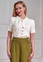 “Delicate details, endless style.” Ze is super veelzijdig, zacht en voorzien van een cute strikdetail aan de halslijn, korte mouwtjes en houten knopen. Uitgevoerd in een fijngebreide en stretchy viscosemix in crème, waardoor ze heerlijk comfortabel draagt. * Vaste strikdetail * Korte mouwen * Houten knopenrij * Stretchy ribboorden * Lang genoeg om op een normale heupbroek te dragen