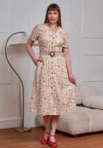 Beleef je eigen summer romance in deze beauty! Deze swing jurk heeft een elegante V-halslijn, reverskraagje, korte mouwen en loopt uit in een prachtige swing rok voor een super vrouwelijk silhouet. Uitgevoerd in een soepele en luchtige, beige100% katoen (stretcht niet) met een roestbruine print. * Swing model * V-halslijn * Reverskraagje * Korte mouwtjes met omslagjes * Reeks knopen * Afneembare riem * Zijwaartse steekzakken * Valt bij een lengte van 1,70 m tot halverwege de kuit