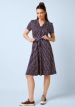 Deze beauty wil je iedere dag wel dragen! De top heeft een elegant kraagje, een reeks knopen en korte mouwen. Uitgevoerd in een soepel vallende en stretchy, donkerblauwe EcoVero viscosemix met een grafische retroprint die heerlijk draagt. * Kraagje * Knopenrij * Korte mouwen * Strikriem in de taille * Zijwaartse steekzakjes * Valt bij een lengte van 1,70 m op de knie