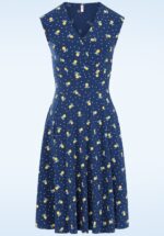 “Bring the zest. Leave the rest.” Deze mouwloze beauty heeft een elegante V-halslijn met vaste overslag en flatterende plooitjes. De subtiele tailleband accentueert je figuur op een natuurlijke manier, terwijl de knielange, zwierige rok prachtig met je meebeweegt. Ze is uitgevoerd in een supercomfortabele, stretchy donkerblauwe bio-katoenmix met witte pindots en citroenen! * Swing model * Mouwloos * Vaste geplooide overslag * Geen rits of knopen; aantrekken en ready to go! * Valt net over de knie bij een lengte van 1,70 m