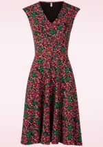 “Cute, comfy & blooming pretty.” Deze comfortabele jurk heeft een elegante V-halslijn met vaste overslag en flatterende plooitjes. De subtiele tailleband accentueert je figuur op natuurlijke wijze, terwijl de knielange, zwierige rok sierlijk met je meebeweegt. Gemaakt van een zachte, stretchy biologische katoenmix in zwart, met een romantische, retro-geïnspireerde print van lieflijke bloemetjes. * Swing model * Vaste geplooide overslag * Geen rits of knopen; aantrekken en ready to go! * Valt net over de knie bij een lengte van 1,70 m