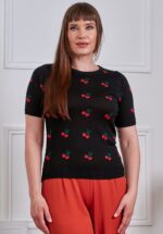 “Cherry-picked for style.” Deze comfy knitted cutie heeft een hoge halslijn, korte mouwtjes en een vrolijke print van smakelijke kersjes. Ze is gemaakt van een heerlijk soepele, fijngebreide en stretchy zwarte viscosemix, waardoor ze supercomfortabel draagt. * Hoge halslijn * Korte mouwtjes * Stretchy ribboord * Lang genoeg om op een normale heupbroek te dragen