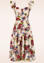“Floral dreams in motion.” Deze prachtige swingjurk is gemaakt van een stevige, maar soepelvallende ivoorwitte katoenmix, versierd met een schitterende bloemenprint in blush en koraaltinten. Dankzij de lichte stretch draagt ze heerlijk comfortabel en beweegt de zwierige rok elegant mee bij elke stap, een echte must-have voor een speelse, zomerse look. * Full swing * Zijwaartse steekzakken * Blinde rits achterzijde * Combineer met een van onze petticoats voor een extra feestelijk effect * Valt bij een lengte van 1,70 m over de knie