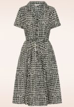 ”Find me where the waves are!” Deze luchtige swing beauty heeft een elegante V-halslijn, reverskraagje, korte mouwen en loopt uit in een prachtige swing rok, die jou een prachtig vrouwelijk silhouet geeft! Uitgevoerd in een soepele en luchtige, crème kleurige 100% katoen voorzien van een golf patroon in zwart. * Swing model * V-halslijn * Reverskraagje * Korte mouwen met vaste omslagjes * Reeks knopen * Afneembare riem, voor een extra ‘snatched’ taille * Zijwaartse steekzakken * Valt bij een lengte van 1,70 m tot halverwege de kuit