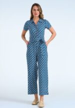 Op deze Bella jumpsuit raak je nooit uitgekeken! Want wow… wat een fantastische print van vliegende zwaluwen! Ze is uitgevoerd in een super zachte, soepele en stretchy bio katoenmix in een staalblauwe kleur, die heerlijk draagt. * Jumpsuit * Puntig kraagje * Korte mouwen * Knopenreeks * Afneembare strikband voor een extra ‘snatched’ taille * It has pockets! * Lange, wijde pijpen