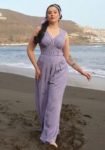 ”Fashion may not be a weapon of the woman, but at least it gives her the ammunition!” Deze Belicia-Violette jumpsuit is afkomstig uit de ”Chérie Bardot” collectie en is geïnspireerd op de vrouwelijke stijl van de legendarische Franse superster Brigitte Bardot! Uitgevoerd in een soepele en luchtige, lavendelkleurige 100% viscose stof (stretcht niet) met een print van witte polkadots die heerlijk draagt. * It has pockets! * Rits- en knoopsluiting voorzijde * Afneembare riem voor een extra ‘snatched’ taille * Lange wijde pijpen met platte plooien