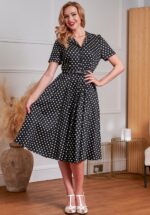 Wat een dotje, deze Bella Polka jurk! Deze luchtige swing beauty heeft een elegante V-halslijn, korte mouwen en loopt uit in een prachtige swing rok, die jou een prachtig vrouwelijk silhouet geeft. Uitgevoerd in een soepele, zwarte katoenmix met een lichte stretch voorzien van witte dotjes. * Swing model * V-halslijn * Reverskraagje * Korte mouwen met vaste omslagjes * Reeks knopen * Afneembare riem * Zijwaartse steekzakken * Valt bij een lengte van 1,70 m tot halverwege de kuit