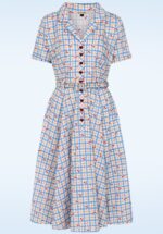 “Swingy cotton, checked charm, cherry cute.” Deze swing jurk heeft een elegante V-halslijn, reverskraagje, korte mouwen en loopt uit in een prachtige swing rok voor een super vrouwelijk silhouet. Uitgevoerd in een stevige, maar soepele 100% katoen (stretcht niet) met een print van blauwe ruitjes en rode kersjes. * Swing model * V-halslijn * Reverskraagje * Korte mouwtjes met omslagjes * Reeks hartvormige knopen * Afneembare riem * Zijwaartse steekzakken * Valt bij een lengte van 1,70 m tot over de knie