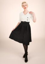 ”Let the outfit do the talking!” Deze contrasterende swing beauty met 1/2 mouwtjes en een elegante overslag top is voorzien van grote knopen is uitgevoerd in een iets dikkere, maar soepele zwarte en gebroken witte stof met een hele lichte stretch, die heerlijk draagt. * Swing jurk * V-hals met vaste overslag en verborgen drukknoopje * 1/2 mouwtjes met vaste omslagjes * Knopenreeks voorzijde * Afneembare riem, voor een extra ‘snatched’ taille * Voorzien van zakken! * Valt bij een lengte van 1,70 m over de knie