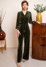 ”There’s something magical about velvet” Een tijdloze jumpsuit met een top voorzien van een overslag, lange pofmouwen en vaste strikbanden. Ze sluit perfect aan in de taille en de flatterende wijde pijpen laten je benen super lang lijken. Uitgevoerd in een zacht en soepel, stretchy olijfgroen velours stof die heerlijk draagt. Dit iconische kledingstuk is ideaal voor zowel naar je werk, als naar een feestje… must-have! * Vaste overslag * Lange pofmouwen * Vaste strikbanden * Blinde rits achterzijde * Lange, wijde pijpen
