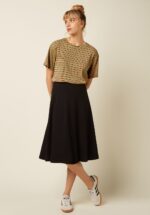 “Sustainable stripes with a retro twist!” De gestreepte print in warme herfstkleuren geeft haar die typische seventies flair, terwijl de flatterende midi-lengte en de elastische tailleband zorgen voor een comfortabele, vrouwelijke pasvorm. Uitgevoerd in een zachte, soepele EcoVero viscosemix die duurzaam geproduceerd is en heerlijk aanvoelt op de huid. * A-lijn * Elastische tailleband * Geen rits of knopen; aantrekken en ‘ready to go’! * Valt bij een lengte van 1,70 m over de knie