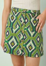 “Mini skirt, major sixties vibes.” Deze Garbo Cadiz minirok is speels, vrouwelijk en typisch sixties dankzij de flatterende A-lijn en de tortoise knopen aan de voorzijde. Ze is uitgevoerd in een stevige, organische katoenmix (stretcht niet) en voorzien van een prachtige geometrische retro print. * A-lijn * Doorknoop model * Voorzien van riemlusjes * Voorzien van zakken! * Valt bij een lengte van 1,70 m boven de knie