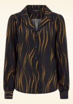 ”Why be moody when you can wear this groovy blouse?!” Bella heeft een lossere pasvorm, een elegante revers kraag, lange pofmouwen en is uitgevoerd in een dunne en soepele zwarte EcoVero viscosemix (stretcht niet) met een grafische retroprint in okergeel. * Lossere pasvorm * Revers kraagje * Lange pofmouwen met manchetten * Reeks knopen voorzijde * Lang genoeg om op een normale heupbroek te dragen