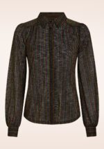 “Glam it up, the seventies way!” Deze prachtige blouse straalt seventies glamour uit met haar kleurrijke strepen in geel, groen en paars. Ze heeft lange pofmouwen en een puntige kraag die zorgen voor een vrouwelijke, elegante uitstraling. De ingewerkte lurex glitterdraad geeft haar een subtiele sparkle die elke outfit doet stralen. Uitgevoerd in een soepele, licht doorschijnende en stretchy stofmix die heerlijk draagt. * Puntig kraagje * Lange pofmouwen met manchetten * Knopenrij * Lang genoeg om op een normale heupbroek te dragen