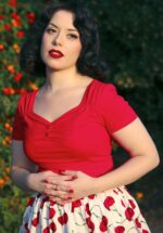 ”Got my red on, now watch me glow!” Deze Carly top in rood is een veelzijdige top in Pin-Up stijl! Ze heeft een elegante diamantvormige halslijn, korte mouwtjes en is afgewerkt met charmante plooitjes en decoratieve hartjes knoopjes ;-). Uitgevoerd in een zachte en stretchy rode katoenmix voor een heerlijk draagcomfort. De perfecte top die overal mee gecombineerd kan worden! * Diamantvormige halslijn * Korte mouwen * Subtiele plooitjes met decoratieve knoopjes * Lang genoeg om op een normale heupbroek te dragen
