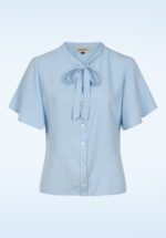 ”Spring on my mind and I’m feeling fine!” Deze prachtige May Wave blouse in lichtblauw is een must-have dit seizoen! Ze heeft speelse vaste strikbanden in de hals, korte vlindermouwtjes en schattige parelmoer knoopjes in de vorm van hartjes. Ze is uitgevoerd in een luchtige en soepele lichtblauw gekleurde 100% viscose voorzien van een subtiel all-over patroon van golfjes. * Vaste strikbanden * Korte vlindermouwtjes * Knopenrij * Lang genoeg om op een normale heupbroek te dragen