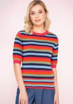 “Hello knitted pretty!” Deze schattige gebreide top is uitgevoerd in fijngebreide, soepele en stretchy organische katoen en is voorzien van een gekleurd, geschulpt streepjespatroon in groen-, blauw- en rozetinten. * Ronde halslijn * Korte mouwen * Stretchy ribboord * Lang genoeg om op een normale heupbroek te dragen * 100% organische katoen
