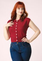 “Buttoned up… but never boring.” Deze gebreide cutie ademt pure retro charme! Ze is mouwloos, heeft een puntig kraagje en een knopenreeks aan de voorzijde. Het opengewerkte patroon aan de bovenzijde geeft haar een speelse, vrouwelijke touch, terwijl de 100% katoenen kwaliteit in rood zorgt voor een heerlijk draagcomfort. Perfect te combineren met een high-waist rok of broek voor een look die zo uit de fifties is weggelopen. * Puntig kraagje * Opengewerkt patroon * Knopenreeks voorzijde * Lang genoeg om op een mid-waist broek of rok te dragen * Exclusief bij Topvintage verkrijgbaar