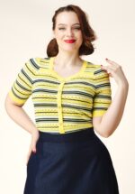 “Stripe, shine & feel fine!” Deze zonnige top is ontworpen door onze eigen in-house designers en combineert comfort met charmante details. Ze heeft een subtiele sweetheart halslijn, 1/2 mouwtjes en een vrolijk streeppatroon in blauwtinten op een frisse gele basis. De sierlijke parelknopen geven een elegante touch, terwijl de zachte, fijngebreide viscosemix heerlijk comfortabel draagt. * Subtiele sweetheart halslijn * 1/2 mouwtjes * Decoratieve knopenreeks * Opengewerkt ajourpatroon * Stretchy ribboorden * Lang genoeg om op een normale heupbroek te dragen * Exclusief bij Topvintage verkrijgbaar