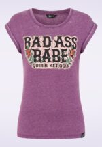 “Be bold, be kind, be a badass babe!” Laat je inner rockabilly queen stralen in dit stoere, maar vrouwelijke T-shirt! Ze heeft korte, nonchalant opgerolde mouwtjes en een opvallende print met de tekst ‘Badass Babe’, omringd door rozen. Ze is uitgevoerd in een zachte, ademende katoenmix in een rijke pruimpaarse tint met een gemêleerde vintage-wassing — heerlijk om te dragen en een echte statement look! * Korte ‘opgerolde’ mouwtjes * Lang genoeg om op een normale heupbroek te dragen