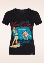 ”What a catch!” Dit T-shirt heeft een speels V-halsje, korte mouwen en een geweldig grappige print. Uitgevoerd in een heerlijke zachte en stretchy katoenmix in zwart die een genot is om te dragen. * V-halslijn * Korte mouwen * Lang genoeg om op een normale heupbroek te dragen