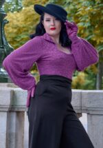 Elegant en schattig deze 50s Addicted Sweater in Aubergine! Eenvoudig maar toch speciaal door de lieflijke details. De top heeft een mooie ”slash” halslijn en flatterende 3/4 mouwtjes met splitjes die afgezet zijn met kleine vaste strikjes, só cute! Uitgevoerd in een heerlijke soepele, stretchy auberginepaarse viscosemix die zijn perfecte pasvorm zal blijven behouden, zelfs na een aantal wasbeurten. Een veelzijdige classy top die niet mag ontbreken in de kast van iedere vintage lady, de naam zegt al genoeg; wij zijn addicted! * ”Slash” hals * 3/4 mouwen met strikjes * Lang genoeg om op een normale heupbroek te dragen