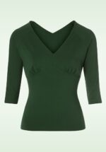 Hello there, sassy Betty Top in Dark Green! Betty heeft een V-halslijn die een mooie decolleté laat zien, geplooide cups en flatterende 1/2 mouwen. Uitgevoerd in een heerlijk soepele, stretchy, donkergroene katoen die zijn perfecte pasvorm zal blijven behouden, zelfs na een aantal wasbeurten. Betty who? Betty Boop?! Vavavoom! * V-halslijn * Gevoerde, geplooide cups * 1/2 mouwen * Lang genoeg om op een normale heupbroek te dragen