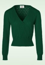 Deze 50s Instinct Wrap Top in Forest Green laat je op en top vrouw voelen! Je zult menig mannenharten op hol doen slaan wanneer jij deze prachtige overslag top draagt! Natuurlijk is het stijltje op zich al mooi maar het geschulpte ribboord en elegant opengewerkt ajour druppelpatroon maken het geheel helemaal af. Uitgevoerd in een stretchy, fijngebreide donkergroene viscosemix voor een héérlijk draagcomfort. Your first instinct is always right… and our instinct tells us we should have this fabulous top! 😉 * Loose-fit * Vaste overslag * Lange mouwen * Geschulpt ribboord * Lang genoeg om op een normale heupbroek te dragen