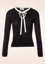 Deze First Love Knit Top in Black is er eentje om verliefd op te worden! De naam, ‘First Love’, zegt eigenlijk al genoeg 😉 De top heeft een mooie ronde halslijn en een speelse keyhole met vaste strikbandjes, cute! De witte biesjes en het opengewerkte patroontje zorgen voor de finishing touch. Uitgevoerd in een heerlijk soepele zwarte mix van viscose en katoen die licht stretcht en zijn perfecte pasvorm zal blijven behouden, zelfs na een aantal wasbeurten. Een veelzijdige top die niet mag ontbreken in de kast van een echte retro lady! * Ronde halslijn * Keyhole * Vaste strikbandjes * Lange mouwen * Opengewerkt patroon * Lang genoeg om op een normale heupbroek te dragen