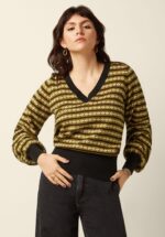 “Stripe, shine & feel fine!” Deze zonnige top is ontworpen door onze eigen in-house designers en combineert comfort met charmante details. Ze heeft een subtiele sweetheart halslijn, 1/2 mouwtjes en een vrolijk streeppatroon in blauwtinten op een frisse gele basis. De sierlijke parelknopen geven een elegante touch, terwijl de zachte, fijngebreide viscosemix heerlijk comfortabel draagt. * Subtiele sweetheart halslijn * 1/2 mouwtjes * Decoratieve knopenreeks * Opengewerkt ajourpatroon * Stretchy ribboorden * Lang genoeg om op een normale heupbroek te dragen * Exclusief bij Topvintage verkrijgbaar