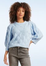 “Cozy sweater season is upon us!” 😉 Deze cutie heeft een ronde halslijn en 3/4 pofmouwen. Ze is uitgevoerd in een super zachte, warme en grofgebreide lichtblauwe stofmix met een opengewerkt patroon. * Loose fit * Ronde halslijn * 3/4 pofmouwen * Stretchy ribboord * Lang genoeg om op een mid-waist broek te dragen