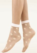 ”Cute as a daisy!” Deze enkelhoge 20 denier kousjes zijn gemaakt van een kwalitatief hoogwaardig poederkleurig stofje met een print van madeliefjes en een wit boordje. Ze mogen gezien worden en zijn dan ook super cute in combinatie met een paar mooie pumps of sneakers. * 20 denier * One size * Versterkt teengedeelte * Enkel hoog