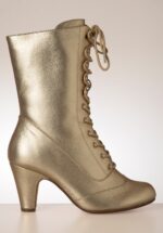 ”There’s a hint of forties flair hanging in the air!” Deze feestelijke veter booties zijn uitgevoerd in hoogwaardig metallic goud imitatieleder, afgewerkt met een rond neusje en een stevige, hoge hak. * Booties * Rond neusje * Vetersluiting met extra set veters! * Ritssluiting zijkant * Stevige, hoge hak * Comfortabele binnenzool van leder * Anti-slip zool