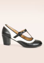 “A nod to the past. A step into now.” Vintage inspired pumps met een T-strap bandje, brogue details en een niet al te hoog, breder hakje. Uitgevoerd in een combinatie van hoogwaardig zwart en ivoorwit kunstleder. * T-strap pumps * Verstelbaar bandje * Brede hak * Comfy binnenzool * Anti-slip zool