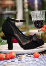 ”Besides chocolate, these pumps are my favourite!” Deze classy maar speelse zwarte pumps uit de ‘Chocolate Fondue’ collectie zijn uitgevoerd in een combinatie van hoogwaardig suède en mesh met een polkadot flock print, afgewerkt met een verstelbaar enkelbandje, een hoge hak en een afneembare strik corsage. * LOLA RAMONA ♥ TOPVINTAGE * Mary Jane stijl pump * Afneembare strik corsage (op meerdere manieren te dragen) * Suède/mesh * Amandelvormig neusje * Verstelbaar enkelbandje met handige haaksluiting * Hoge hak * Binnenzijde geheel van leder * Antislip-zool met kusjes print