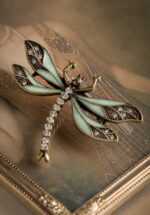 ”Dragonflies are kisses from heaven!” Deze sierlijke, Art Deco inspired broche is uitgevoerd in antiek goudkleurig metaal met prachtige strass steentjes en mintgroen/licht blauw geëmailleerde vleugels. * Antiek goudkleurig metaal * Strass steentjes * Pinsluiting