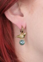 “Let your style take flight.” Deze schattige oorbellen laten je hart meteen een beetje fladderen! De hangertjes met een lief vogeltje zijn gemaakt van 18k verguld roestvrij staal en worden speels aangevuld met een facetgeslepen rhinestone in een groenblauwe tint die prachtig het licht vangt. * Hangertjes * Leverback sluiting * Nikkelvrij (anti-allergeen) * Verguld rvs (18K plating)