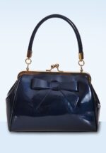 ”California… knows how to party!” Dit kleine zusje van de klassieke American Vintage bag heeft een opvallende goudkleurige metalen klipsluiting voor een echte vintage look en is uitgevoerd in navyblauw imitatie lakleder afgewerkt met een schattige strik. * Small sized * Klipsluiting * Binnenvak met 3 extra vakjes, waarvan 1 met rits * Afneembaar hengsel * Kan crossbody gedragen worden * Volledig gevoerd * Groot genoeg voor je telefoon, sleutels, en een kleine portemonnee