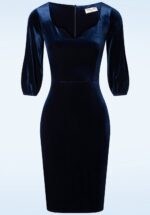 ”Blue velvet if you please!” Iedere vintage loving lady is gek op velvet en dus ook op deze 50s Iris Velvet Pencil Dress in Navy! Ze is superzacht en dankzij haar marineblauw soepel en stretchy fluweelachtig stofje vangt ze het licht prachtig op. Deze beauty is voorzien van een hartvormige halslijn, elastische 3/4 pofmouwen en omarmt je rondingen perfect. Alleen nog wat bling bling toevoegen en jouw look is helemaal compleet! * Aansluitend model * Hartvormige halslijn * Gevoerde top * Elastische 3/4 pofmouwen * Geen split * Ritssluiting achterzijde * Valt net over de knie bij een lengte van 1,70 m