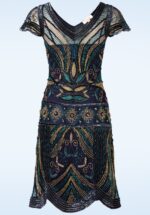 “Roaring ’20s vibes, modern sparkle… flapper fabulous in every step.” Deze hand bewerkte, party-proof jurk is een reproductie van de elegante flapper dresses uit de jaren 20! Uitgevoerd in een zwarte, semi-doorschijnende stof met een donkerblauwe onderjurk, voorzien van een hele lichte stretch. Afgewerkt met glimmende kraaltjes in blauw en goudtinten. “Dazzle, sparkle, repeat!” * Aansluitend model * Handbewerkt * Onderjurkje * V-hals en rug * Geschulpte kapmouwtjes * Geen rits of knopen; aantrekken en ready to party! * Valt bij een lengte van 1,70 m net over de knie * Melissa is 1,78 m * Let op; de kleur van het product op de video kan afwijken van de daadwerkelijke kleur van het product